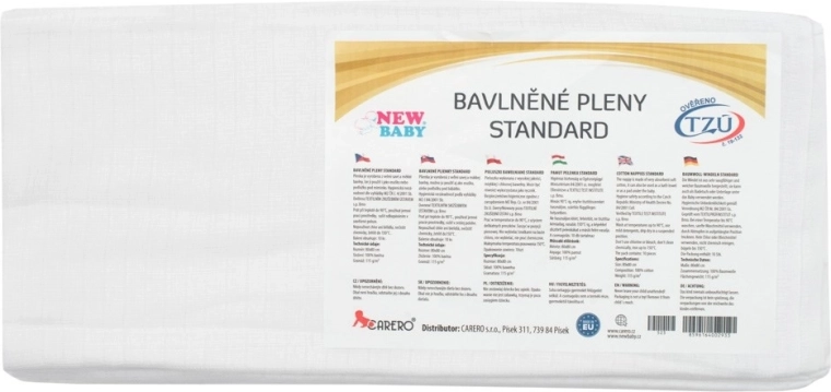 Klassieke katoenen luiers NEW BABY met afmeting 80×80 cm zijn ideaal voor dagelijks gebruik. Ze zijn gemaakt van 100% katoen met een gewicht van 115 g/m², en hebben 2 verstevigde en 2 omgezoomde randen voor extra duurzaamheid en vormvastheid. De verpakking bevat 10 stuks. De luiers zijn gecertificeerd door het Textieltestinstituut in Brno. Drogen in de droger wordt niet aanbevolen.