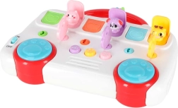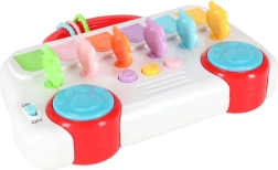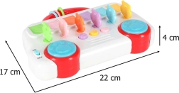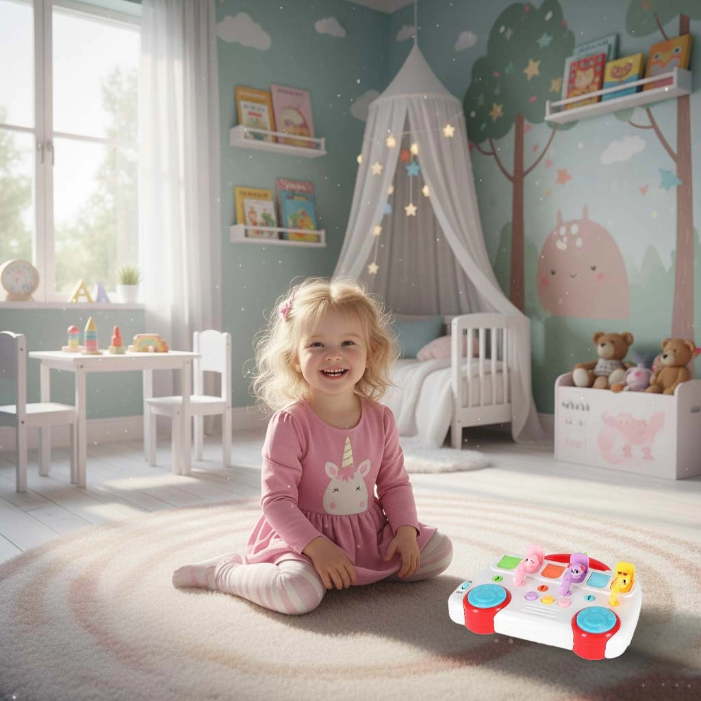 Op het paneel vind je muziekknoppen met melodieën, een volumeknop met 3 niveaus en blauwe “poot”-schakelaars met percussiegeluiden. Dankzij de afwisselende effecten en eenvoudige bediening genieten kinderen van uren creatieve speelpret thuis en onderweg – veilig en met een glimlach.