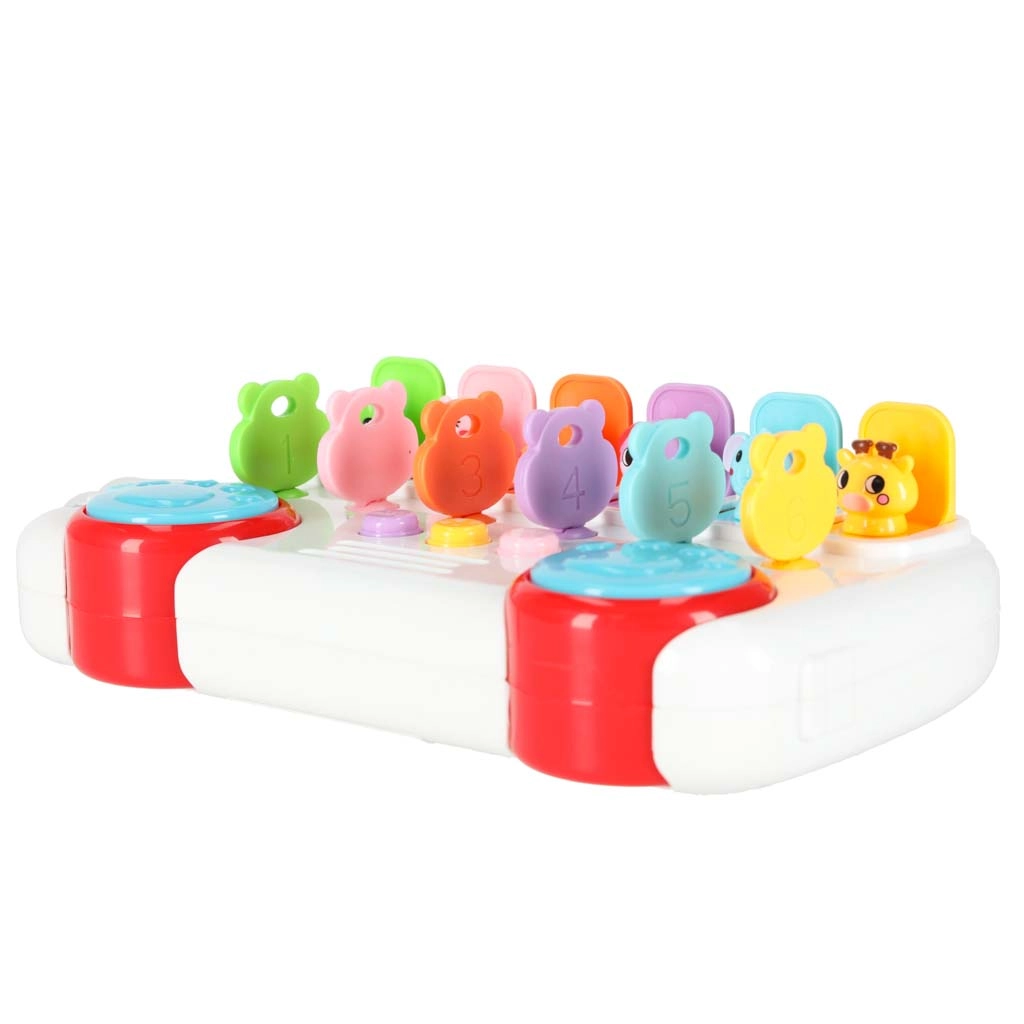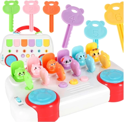 Zes genummerde sleutels in verschillende kleuren stimuleren kinderen om te koppelen en te onderscheiden. Door aan de sleutel te draaien springt het diertje tevoorschijn en klinkt het cijfer in het Engels.