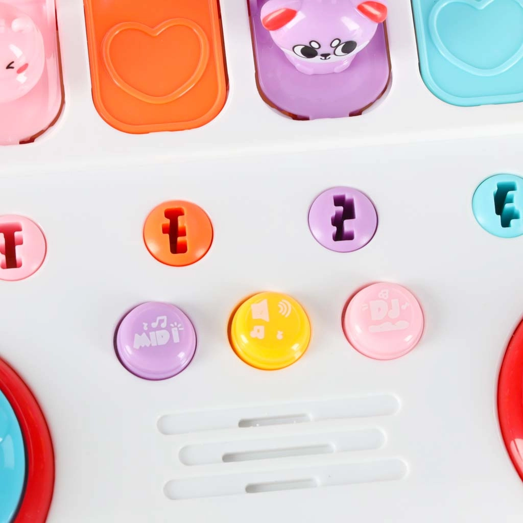 De paarse MIDI-knop speelt 10 melodieën af, de roze DJ-knop 3 melodieën en de gele knop stelt 3 volumeniveaus in.
