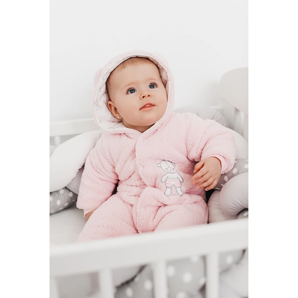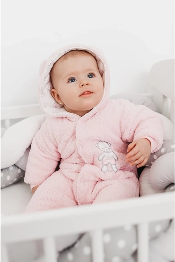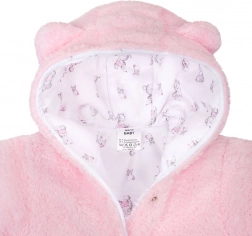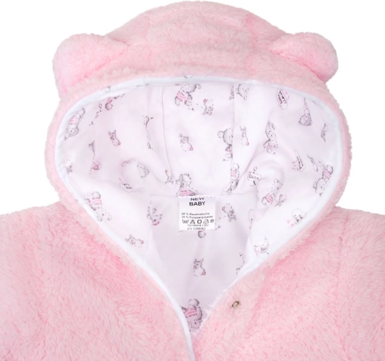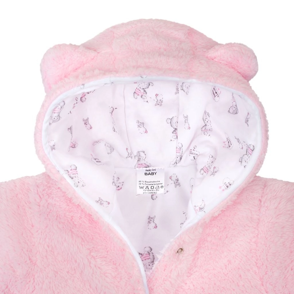 Deze winterse baby overall New Baby Nice Bear in het roze biedt je kleintje knusse warmte en zachtheid de hele koude dag door. De fleece buitenlaag verwarmt, terwijl de binnenste voering van 100% katoen zacht is voor de gevoelige babyhuid. Het schattige beertje en de capuchon met oortjes geven de overall een speelse look.