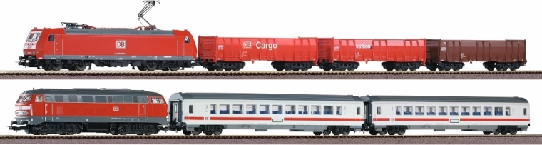 In de verpakking vindt u diesellocomotief BR 218 met twee IC-rijtuigen en elektrische locomotief BR 185 met drie hoge‑wandwagens – een ideale combinatie voor zowel personen- als goederendienst.