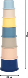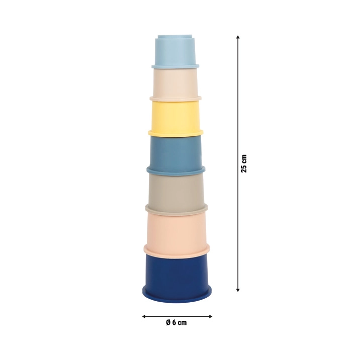De bekers schuiven in elkaar om ruimte te besparen. Het duurzame materiaal is eenvoudig te reinigen en geschikt voor spelen binnen en buiten.