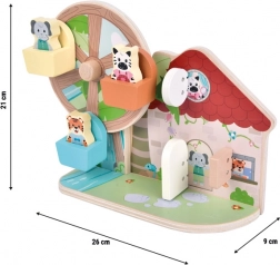 Dit kleurrijke motorische speelgoed van small foot verandert de kinderkamer in een klein pretcentrum. Kinderen zullen het draaien van het reuzenrad met de soepel lopende slinger, het plaatsen van de houten diertjes in de gondels en het ontdekken van de motieven achter de kleurrijke deurtjes geweldig vinden. Het speelgoed stimuleert op natuurlijke wijze de fijne motoriek, oog-handcoördinatie en logisch denken, en bevordert tegelijk de verbeelding en zelfstandig ontdekken.