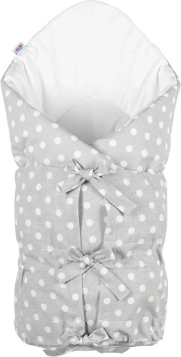 De New Baby wikkeldoek met klassieke vetersluiting is terug als beproefde keuze voor de eerste maanden van je baby. Dankzij drie rijen linten omsluit hij je baby stevig en comfortabel, wat een gevoel van geborgenheid geeft en een rustige slaap bevordert. De zachte katoenen hoes is mild voor de gevoelige huid en het grijze design met stippen laat zich gemakkelijk combineren met de uitzet.