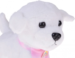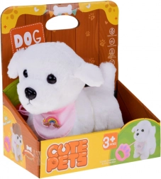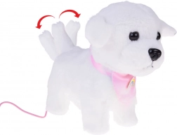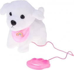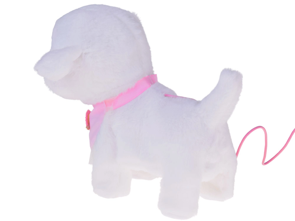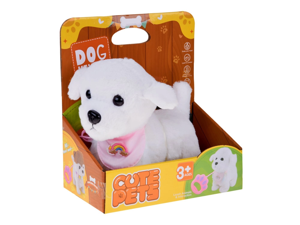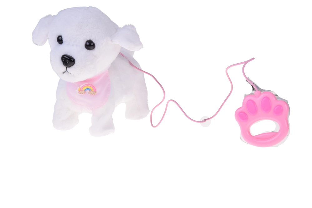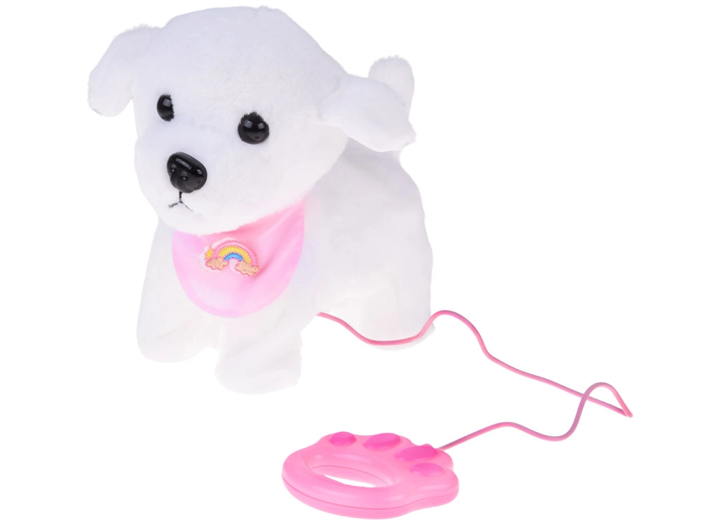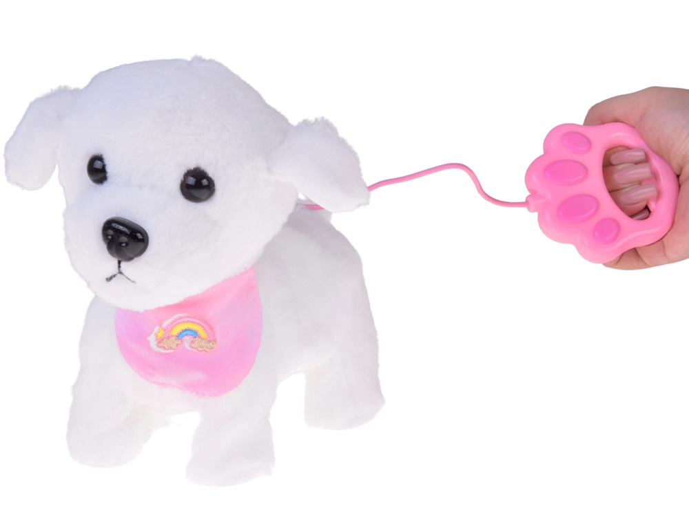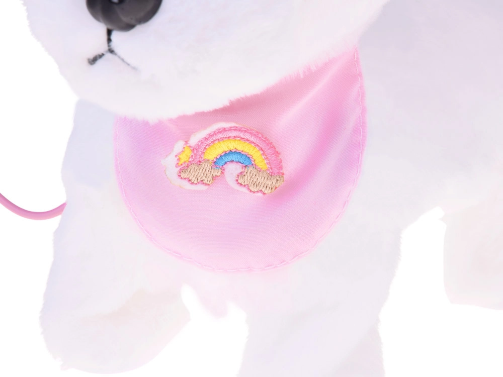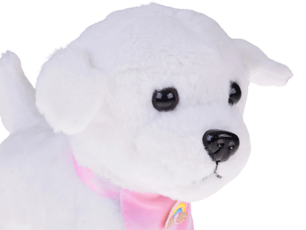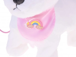 Een schattige interactieve pluchen hond aan de lijn maakt elke kleine dierenliefhebber blij. Bij het indrukken van de knop op de lijn loopt hij, blaft, maakt realistische geluiden en kwispelt met zijn staart. Hij is gemaakt van zacht, aangenaam aanvoelend materiaal en is versierd met een schattige bandana met een regenboog – de ideale vriend voor dagelijks spel én een geweldig cadeau.