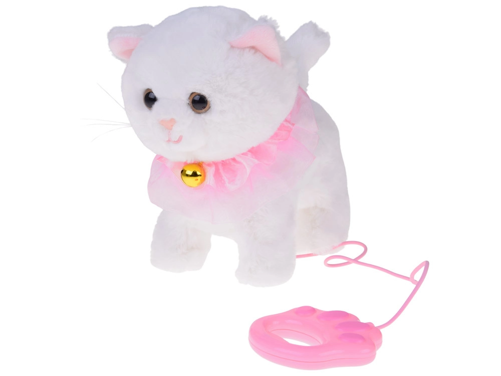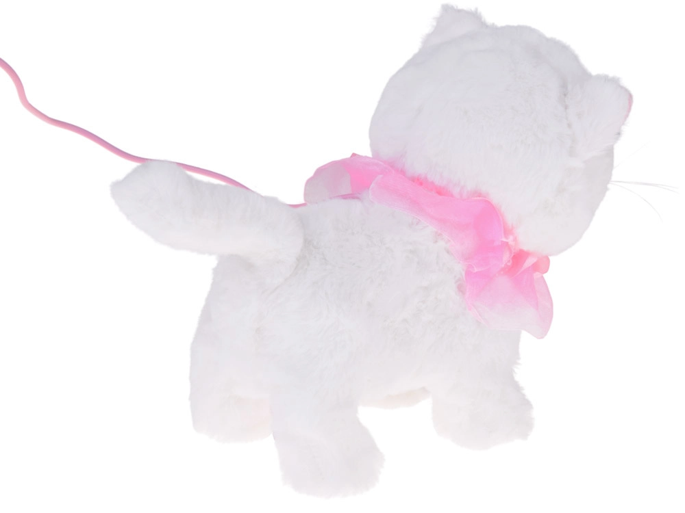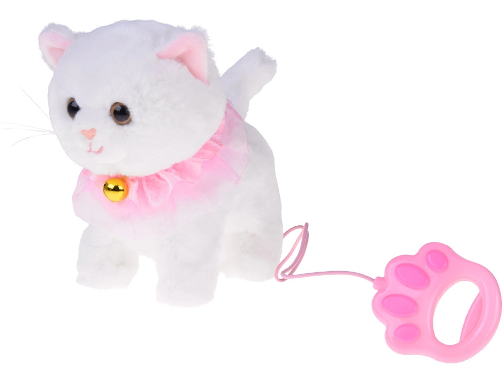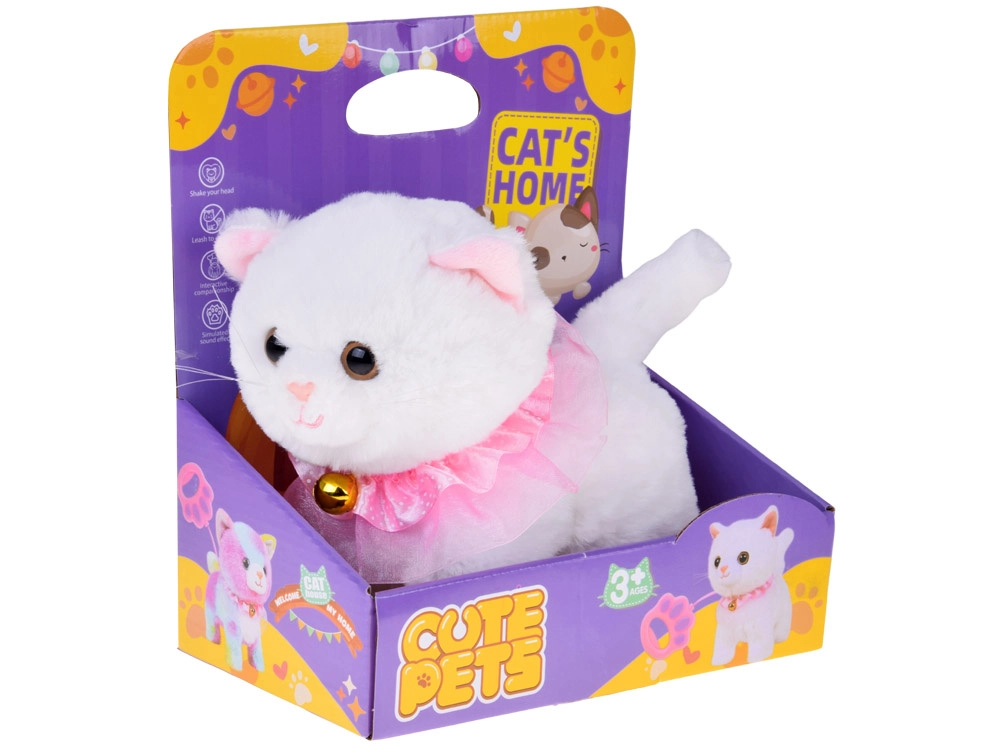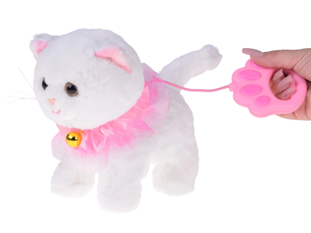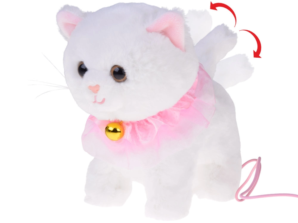 Het interactieve pluchen katertje aan een riem is een geweldige metgezel voor kinderen die dromen van een eigen huisdier. Zet het aan, pak de riem en het kitten loopt vrolijk rond, miauwt en kwispelt met zijn staart. De zachte pluche met glanzende oogjes, een lief neusje en kleine snorharen zorgt ervoor dat kinderen er meteen verliefd op worden.