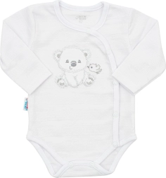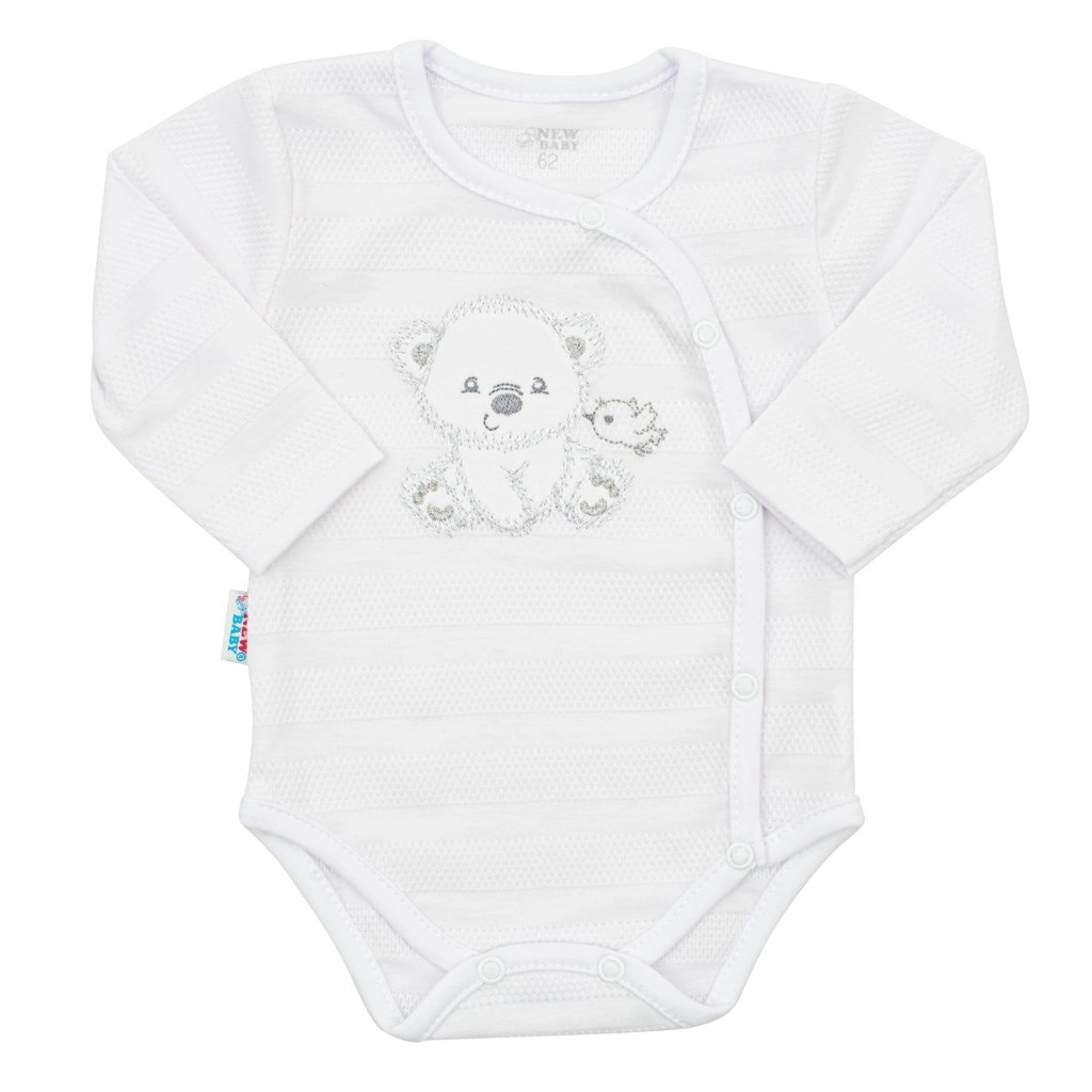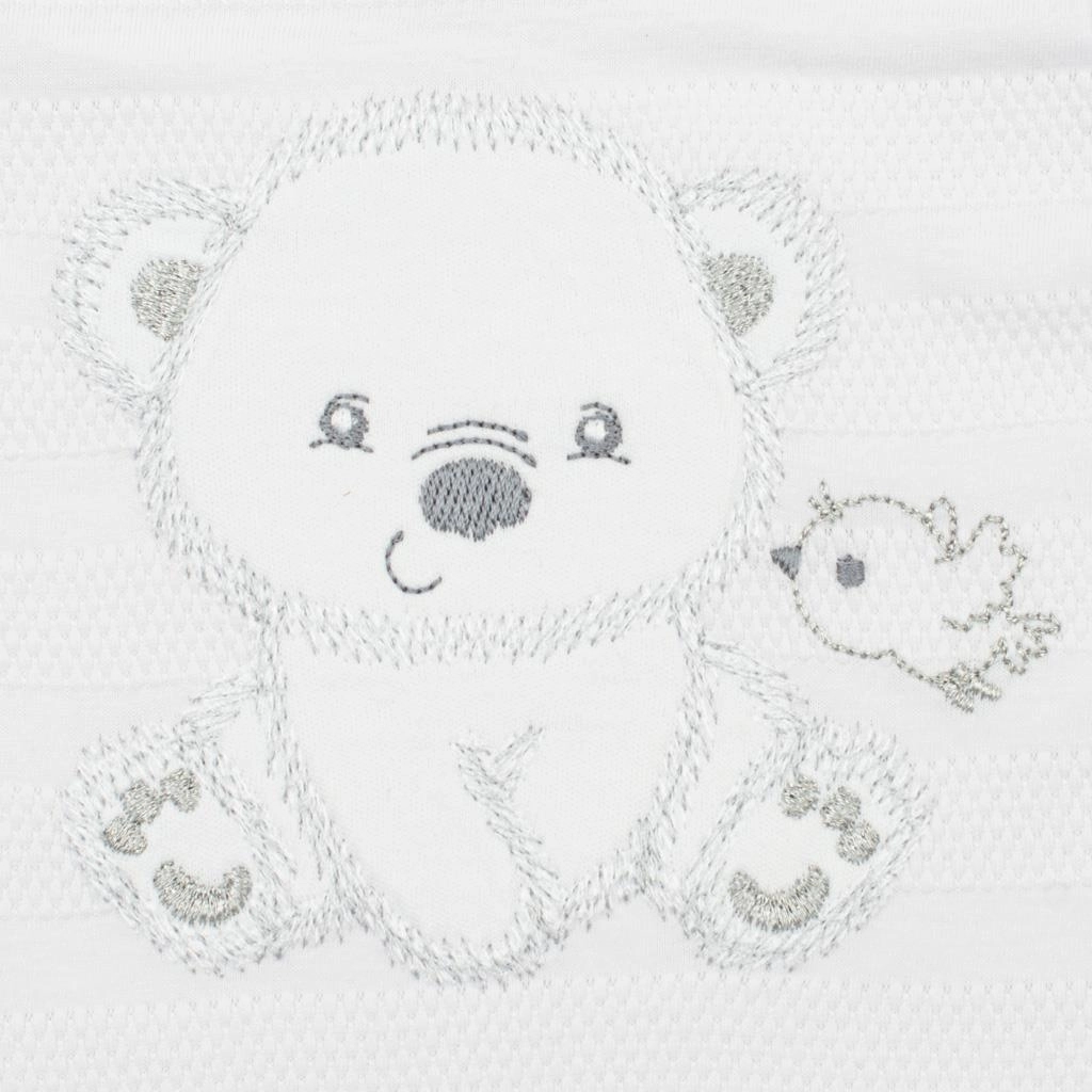 De set kenmerkt zich door een prachtig en uniek design met een aantrekkelijke stofprint. Het rompertje is versierd met een geborduurd beertje met een vogeltje, het boxpakje heeft een bijpassende print, het jasje is effen met contrasterende bies en het mutsje is over de oortjes gevormd met veterstrik voor een veilige en comfortabele pasvorm.