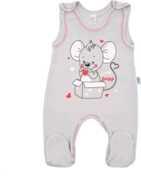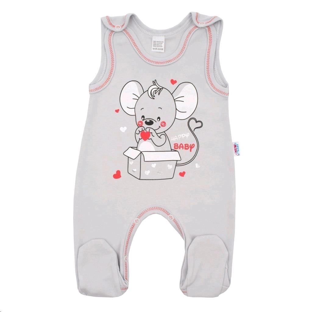 De set is ontworpen in een zachte grijze kleur met gekleurde biezen en een grote muizenprint, wat de outfit een speelse look geeft. Het product komt van het Tsjjechische merk NEW BABY, dat veel waarde hecht aan kwaliteit en comfort voor baby’s.