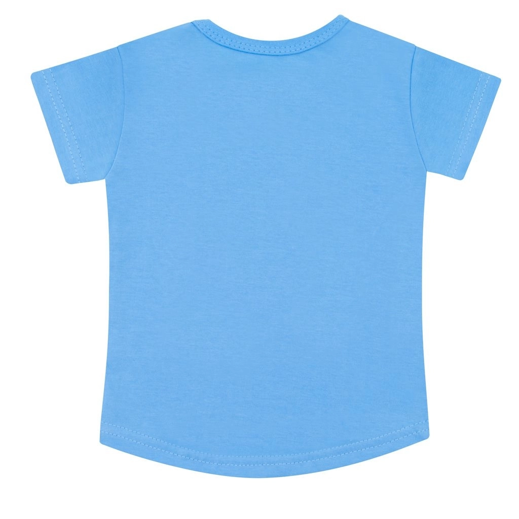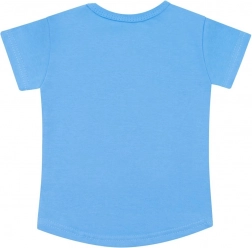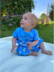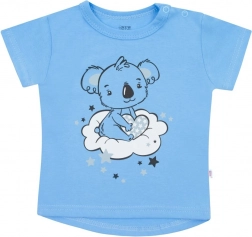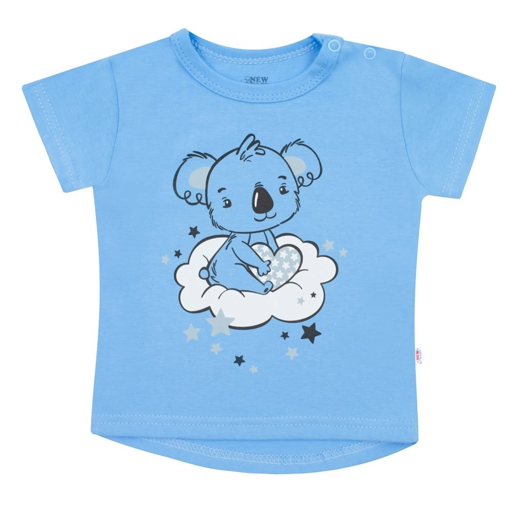 Schattige kinderzomerpyjama New Baby Dream in blauwe kleur van aangename 100% katoen. De set bestaat uit een T‑shirt met korte mouwen en een short. Het T‑shirt is versierd met een lief beertje op een wolkje en sterretjes, en heeft praktische drukknoopjes op de schouder voor gemakkelijk aankleden. De short heeft een all‑over print met beertjes en een bredere elastische tailleband die comfortabel is en niet op het buikje drukt. Ideaal als zomerpyjama en als comfortabele thuisoutfit voor je baby.
