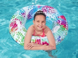 De BESTWAY opblaasring in een kleurrijk design brengt plezier in het water en zorgt voor ontspannen relaxen. Robuust PVC (0,21 mm) garandeert een lange levensduur en weerstand tegen zout water, terwijl de praktische handgrepen het instappen vergemakkelijken en zekerheid bieden tijdens het zwemmen.
