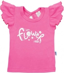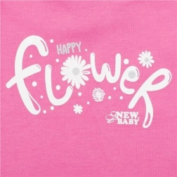 Schattige 2-delige kinderset New Baby Happy Flower in donkerroze, comfortabel en stijlvol. Bevat een T-shirt met ruffelmouwtjes en drukknoopsluiting in de nek op de rug, en sweatpants met een bredere tailleband en bloemenprint. Gemaakt van zachte en ademende 100% katoen voor de hele dag comfort voor de gevoelige babyhuid.