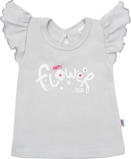 Schattige en comfortabele 2-delige babyset NEW BABY Happy Flower in grijs, bestaande uit een shirt met volantmouwtjes en joggingbroek met bloemenprint. Gemaakt van 100% katoen, zacht voor de babyhuid en ideaal voor dagelijks gebruik. Praktische drukknoopsluiting bij de hals maakt aan- en uitkleden eenvoudig.