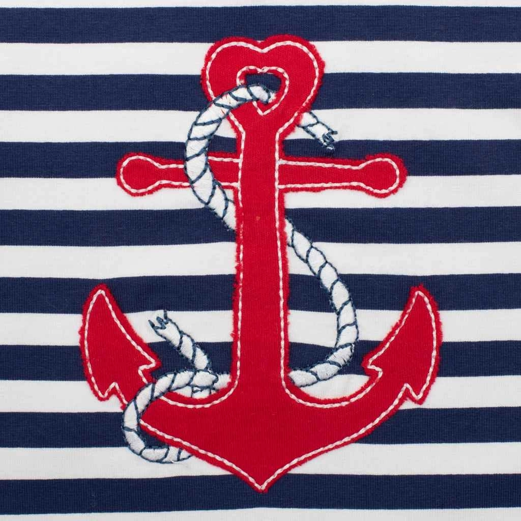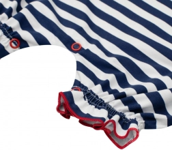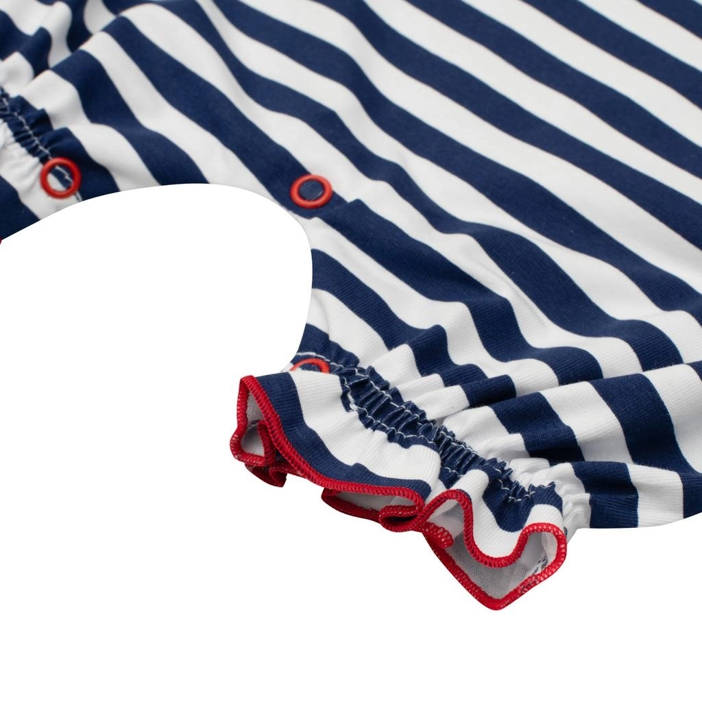 Schattige meisjes zomerse jumpsuit New Baby Marine van aangename 100% katoen biedt comfort en stijl voor elke dag. Hij heeft korte mouwtjes met ruches, een modern gestreept patroon en een ankerapplicatie met een zachte achterkant tegen krassen. Praktische drukknoopsluiting op de schouder en tussen de beentjes maakt aankleden en verschonen eenvoudig.
