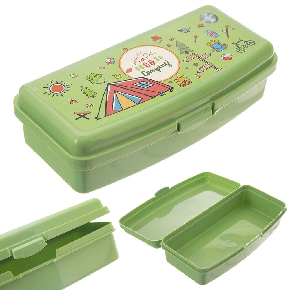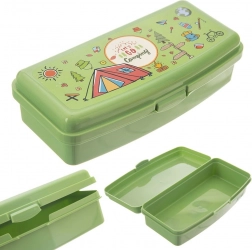 Praktische lunchbox met een inhoud van 500 ml in het groen, ideaal voor canapés, snacks en kleine lekkernijen. Hij heeft compacte afmetingen van 21 × 9,5 × 5,5 cm, een stevige uitvoering van kwaliteitskunststof en een betrouwbare clipsluiting die helpt de versheid te behouden. Versierd met een aantrekkelijke campingprint, waardoor kinderen hun box gemakkelijk herkennen.
