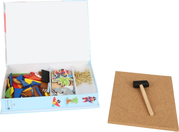 - houten onderdelen met piratenthema, gouden punaise-spijkers, veerkrachtig kurkbord, houten hamertje, 4 dubbelzijdige voorbeeldkaarten, opbergbox