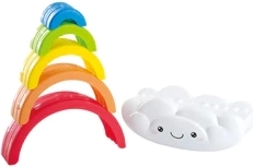 Kleurige regenboogpuzzel met een lachend wolkje die de fijne motoriek, coördinatie en creativiteit ontwikkelt. Kinderen stapelen de gekleurde bogen op elkaar en oefenen geduld en logisch denken tijdens een speelse, vrolijke activiteit.