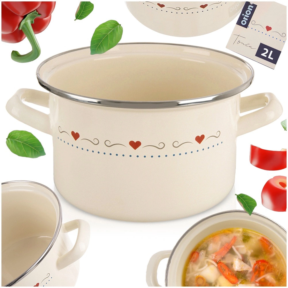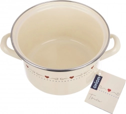 Ontdek een praktische helper voor dagelijks koken. De geëmailleerde pan TONCA in retrostijl is ideaal voor het koken en stoven van soepen, sauzen en hoofdgerechten. Het mooie crèmekleurige design met hartjes siert je keuken en de stevige handgrepen zorgen voor veilige hantering.