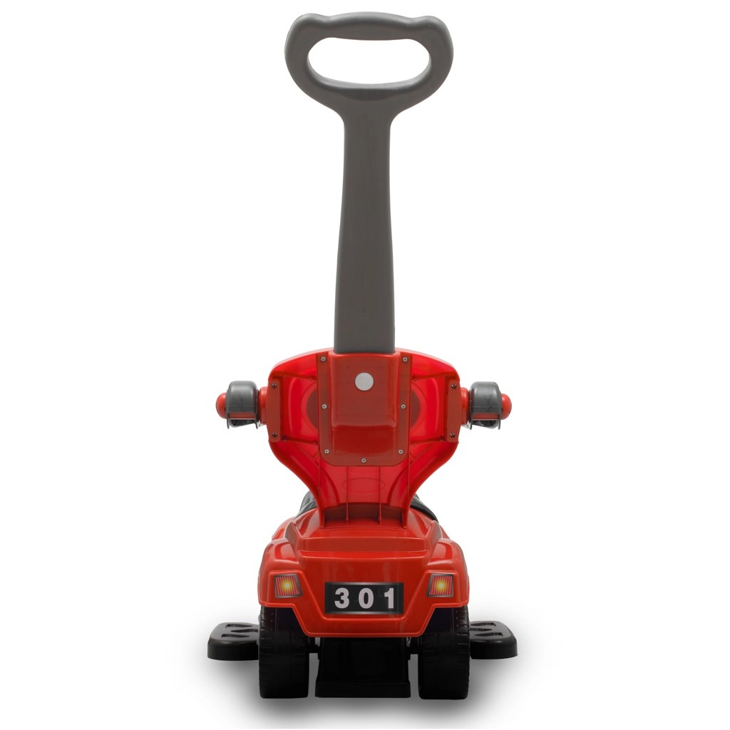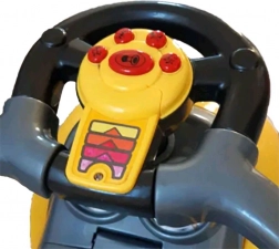 Voor extra comfort is de duwauto uitgerust met onderste voetsteunen en zijdelingse veiligheidsbeschermers, die eenvoudig te demonteren zijn. Het stuur met muziekpaneel en claxon verhoogt het plezier en stimuleert de motorische ontwikkeling. Onder de zitting vind je een praktische opbergruimte voor kleinigheden en speelgoed.