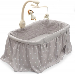 Onderdeel is een mobiel met kleurrijke diertjes, uitgerust met een nachtlampje, een geluidsmodule met 8 melodieën en zachte vibraties – alles met traploze regeling van intensiteit en volume. De praktische onderste mand houdt alle benodigdheden binnen handbereik en de verstevigde binnenvoering met vinyl matras zorgt voor hygiëne en eenvoudig onderhoud.