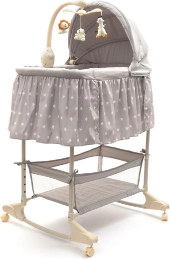De multifunctionele wieg en het bedje NEW BABY is de ideale oplossing voor de dagelijkse zorg voor een pasgeborene. Biedt een viervoudige hoogteverstelling, gemakkelijk verplaatsen dankzij wielen met vergrendeling en de mogelijkheid om te gebruiken als klassieke wieg wanneer ze worden opgeklapt. Eén zijkant kan worden geopend, wat nachtelijk voeden en het kalmeren van de baby vergemakkelijkt. De ademende, aangename hoes kan eenvoudig worden verwijderd en gewassen.