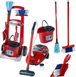 De set is ontworpen zodat kinderen het dagelijkse schoonmaken veilig kunnen nadoen. De robuuste kar in rood-grijze uitvoering met grote wielen is eenvoudig te bedienen en vervoert alle accessoires naar de juiste plek. De speelgoedstofzuiger in het rood heeft een transparante container en zuigt tijdens het spel het meegeleverde granulaat op, dat na het vullen eenvoudig kan worden geleegd – extra realistisch dankzij het stofzuiggeluid.