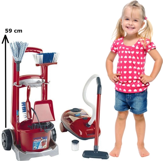 Een leuke en realistische set voor kleine helpers in huis: kinder schoonmaakkar met stofzuiger onder de licentie van VILEDA JUNIOR van KLEIN. Bevat een kar op wieltjes, mop, bezem, stoffer, blik, emmer met wringer en een functionele speelgoedstofzuiger met granulaat. Realistische details, duurzame afwerking en eenvoudige bediening stimuleren creatieve rollenspellen en het nadoen van volwassenen.