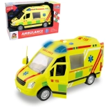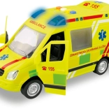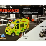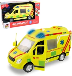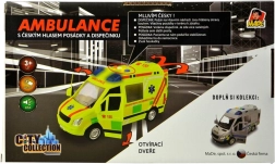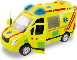 Realistisch ambulancespeelgoed op schaal 1:16 biedt kinderen een authentieke reddingsactie-ervaring. Rijdt op een vliegwiel, heeft een werkende zwaailamp met blauwe lichten, Tsjechische stemmeldingen van bemanning en meldkamer, openende deuren en wordt geleverd inclusief batterijen.