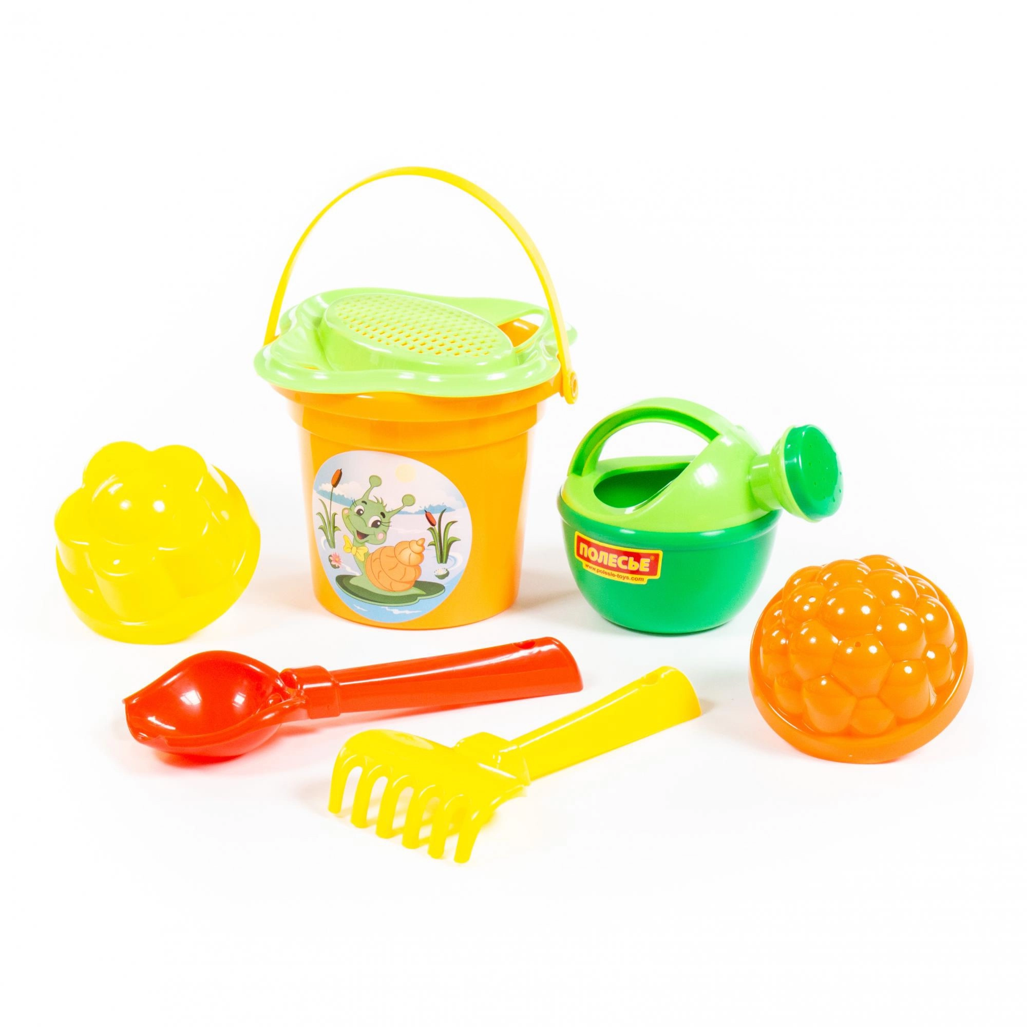 - Emmer met zeef, gietertje, schepje, harkje, 2 vormpjes