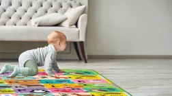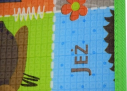 1 cm dik EPE‑foam dempt vallen, isoleert tegen kou en het antislip reliëf geeft zekerheid bij kruipen en de eerste stapjes.