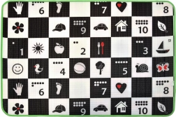 Contrasterend zwart‑wit schaakbord met cijfers en stippen voor eerste rekenoefeningen + kleurrijk alfabet met dieren voor speels leren van letters.