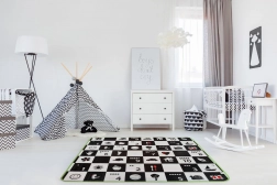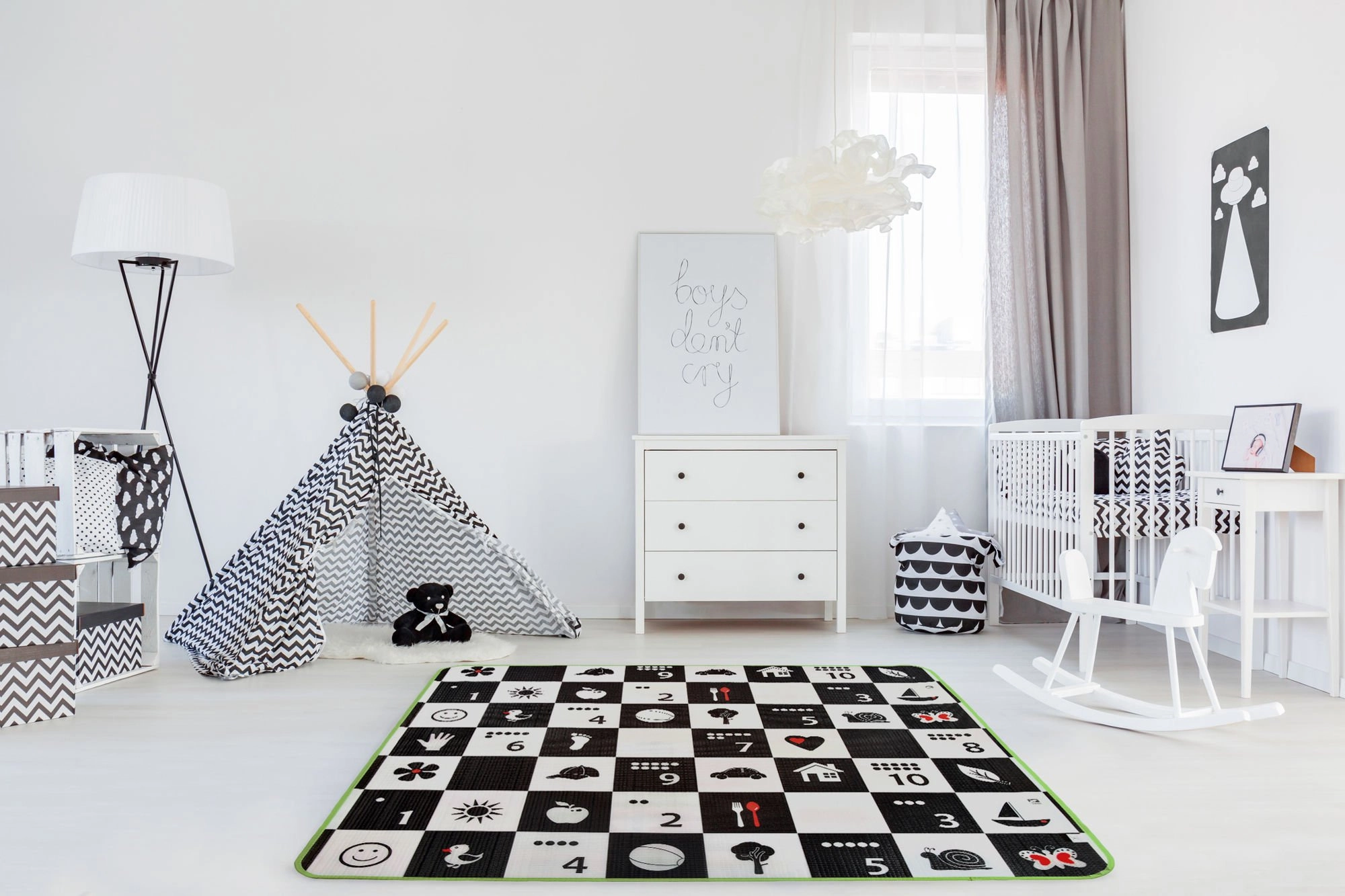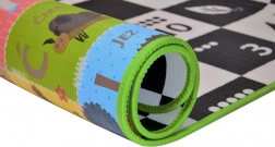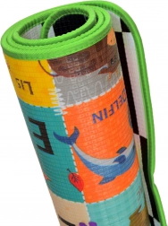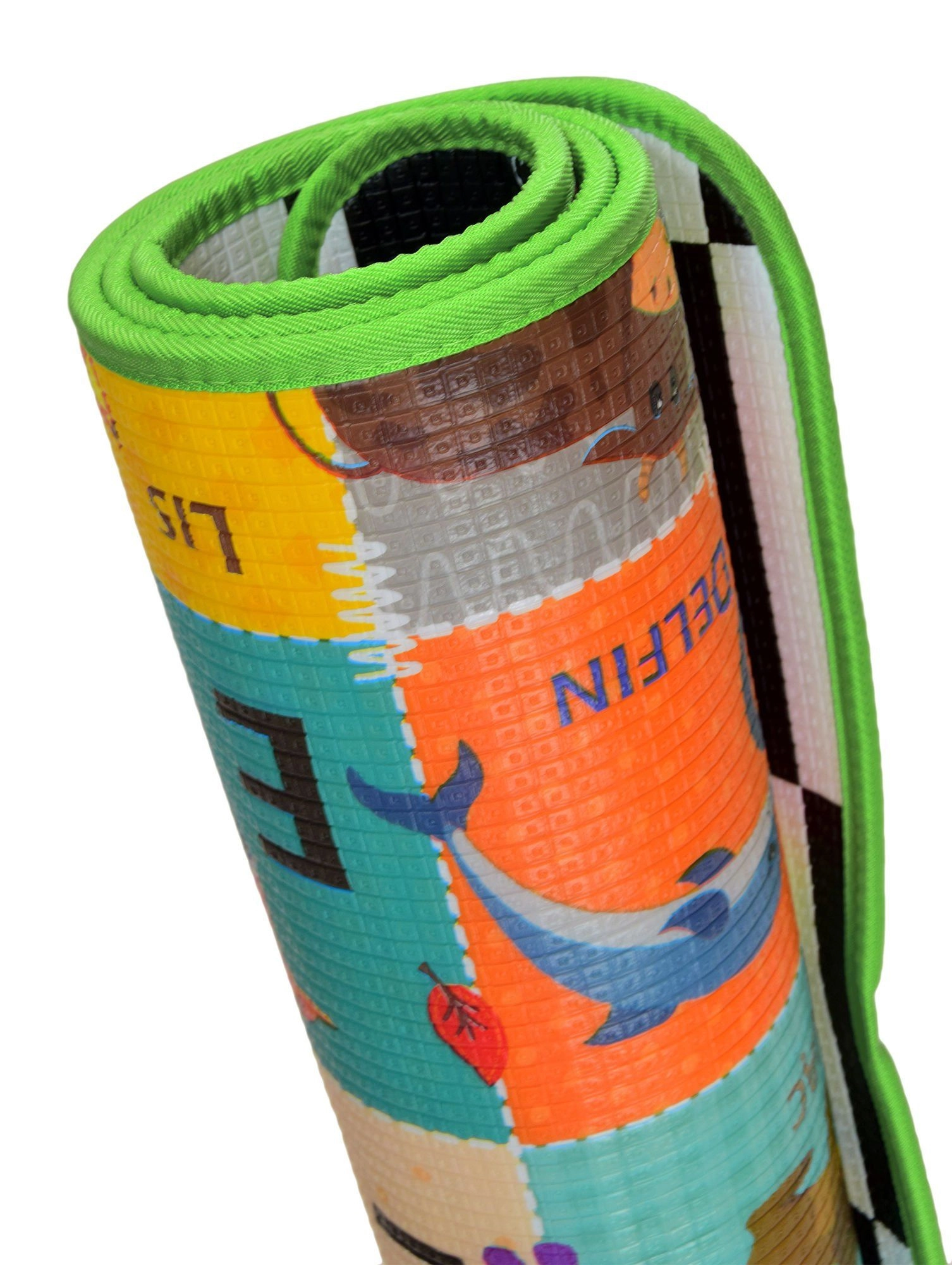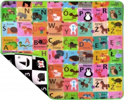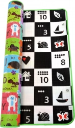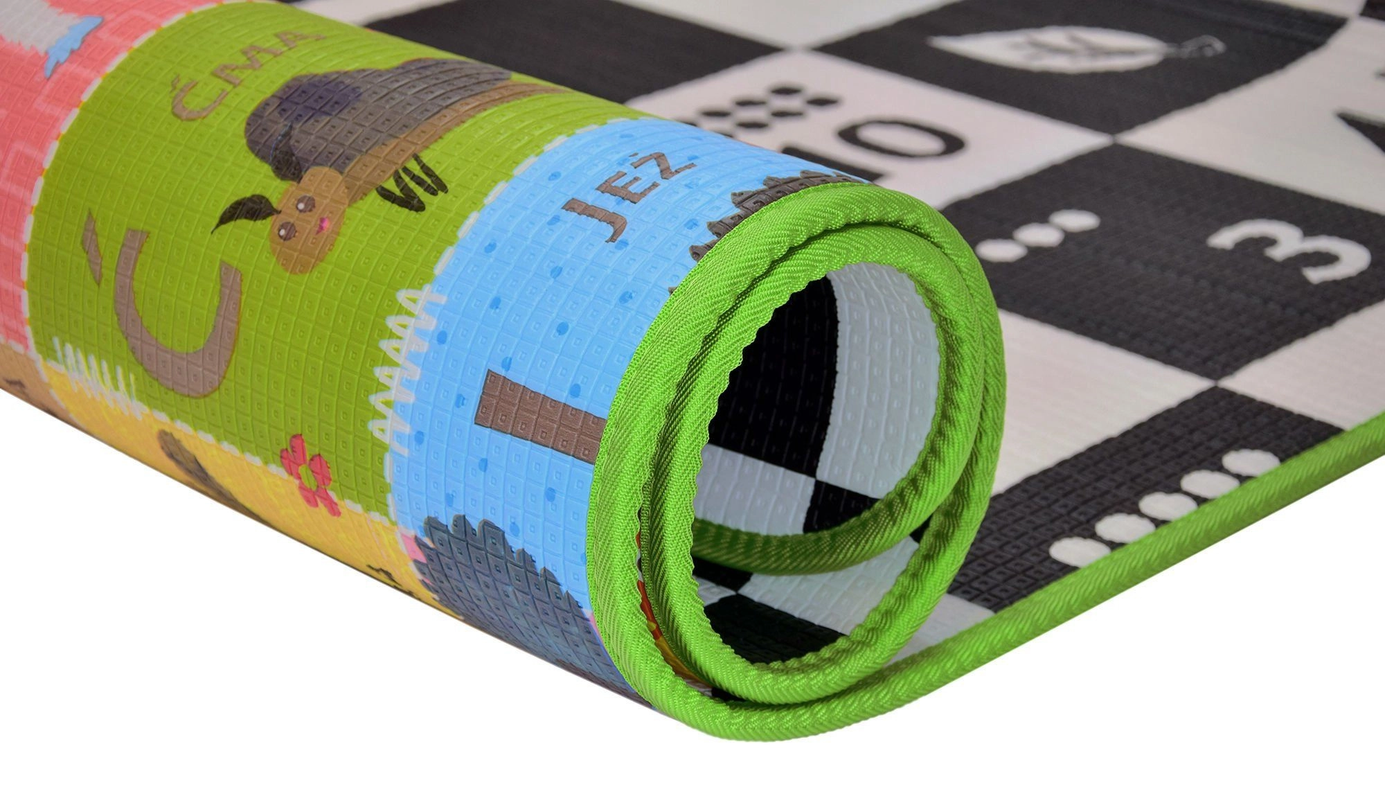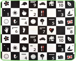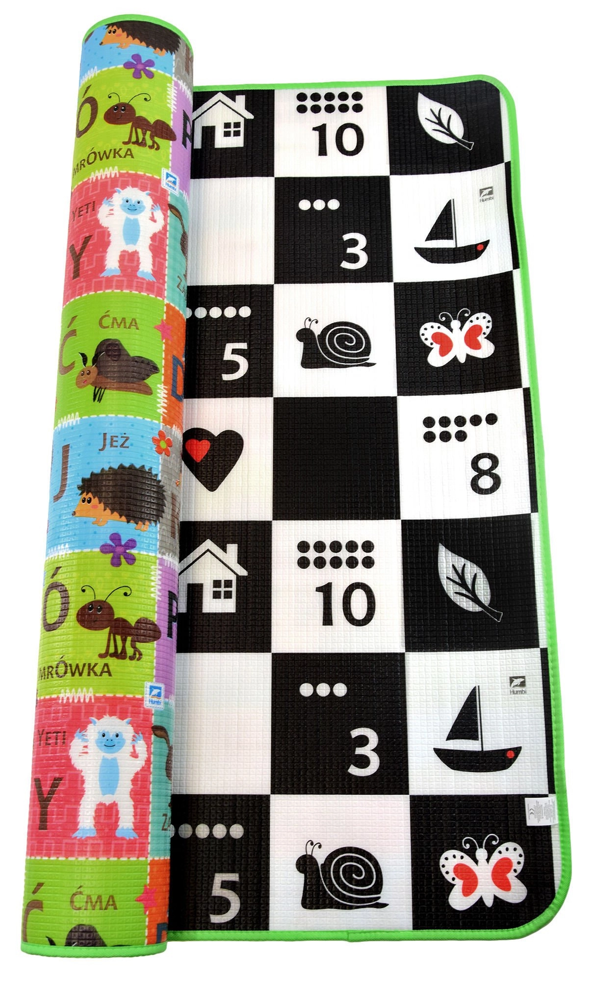 De dubbelzijdige print groeit met je kind mee: het contrasterende zwart‑witte schaakbord met eenvoudige pictogrammen en cijfers met stippen om te tellen stimuleert het zicht van baby’s, de kleurrijke zijde met alfabet en dieren motiveert om letters te leren. De mat kun je eenvoudig oprollen en opbergen in de meegeleverde transporttas met rits – ideaal voor thuis, in de tuin en onderweg.