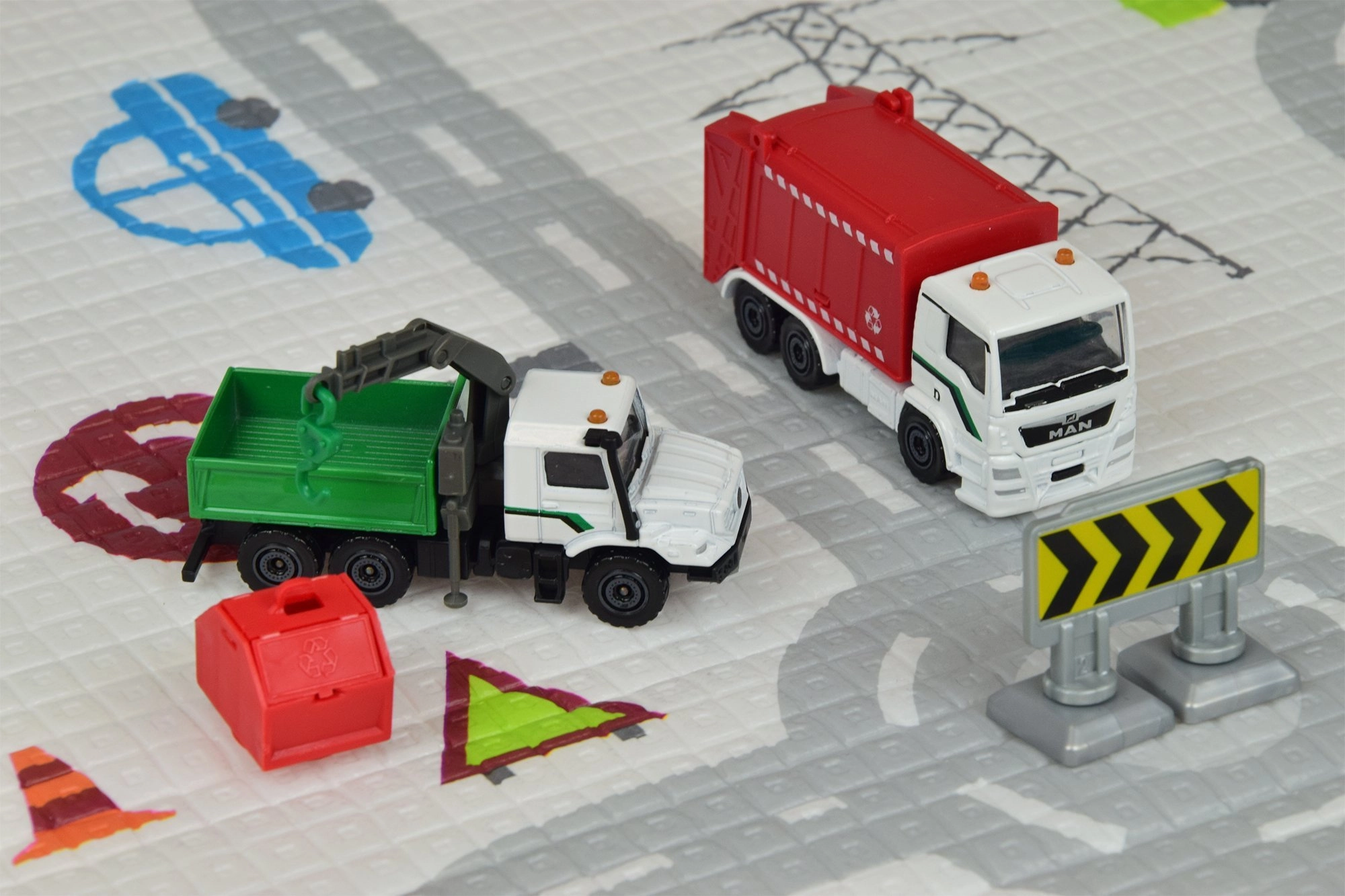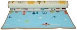 Beide zijden hebben educatieve motieven: aan de ene kant een stad met straatjes voor het rijden met autootjes, aan de andere kant diertjes op een beige achtergrond. Bevat geen formamide, ftalaten, PVC of BPA, voldoet aan EN71-1/2/3 en de REACH-vereisten, en is uiteraard voorzien van CE.