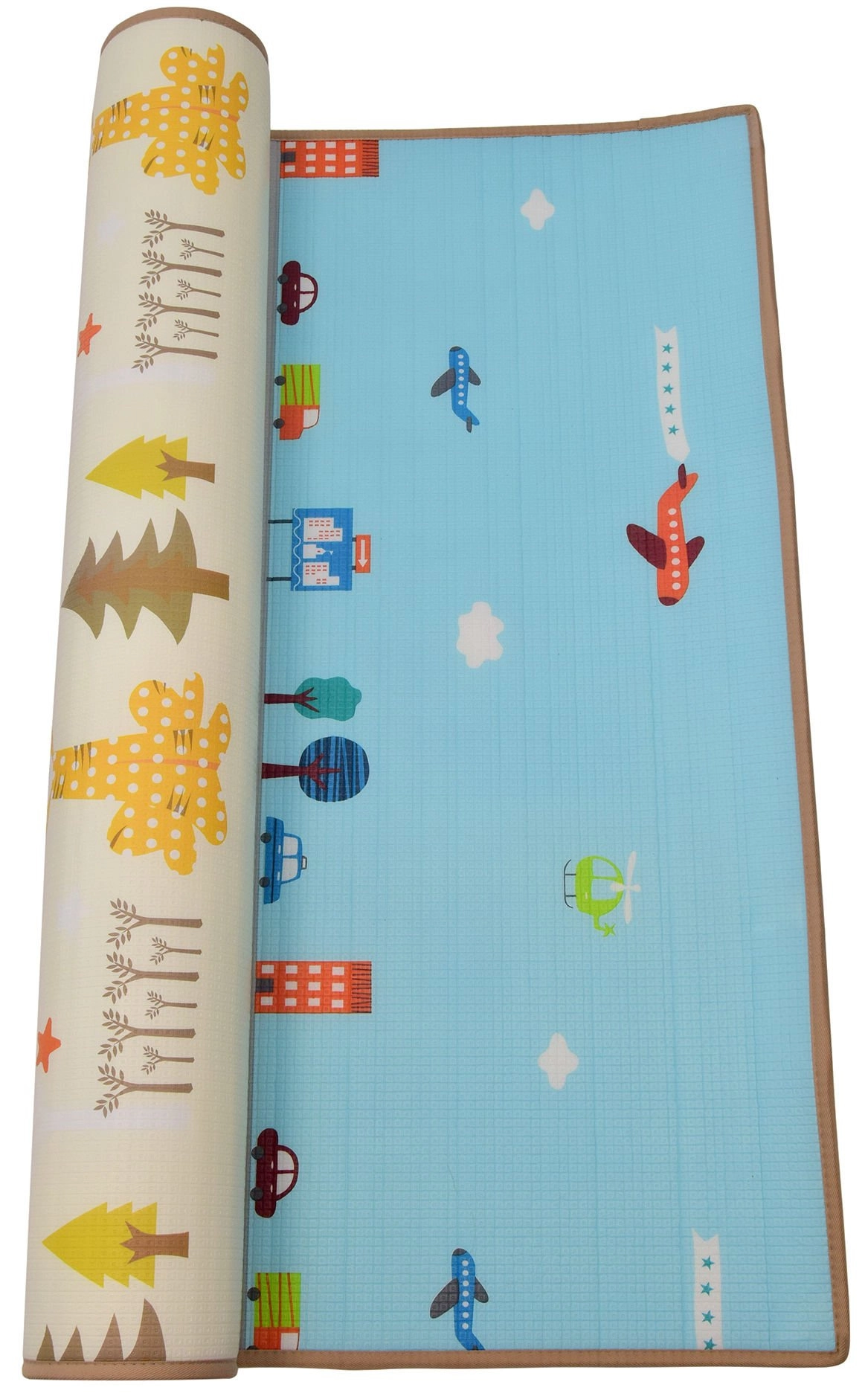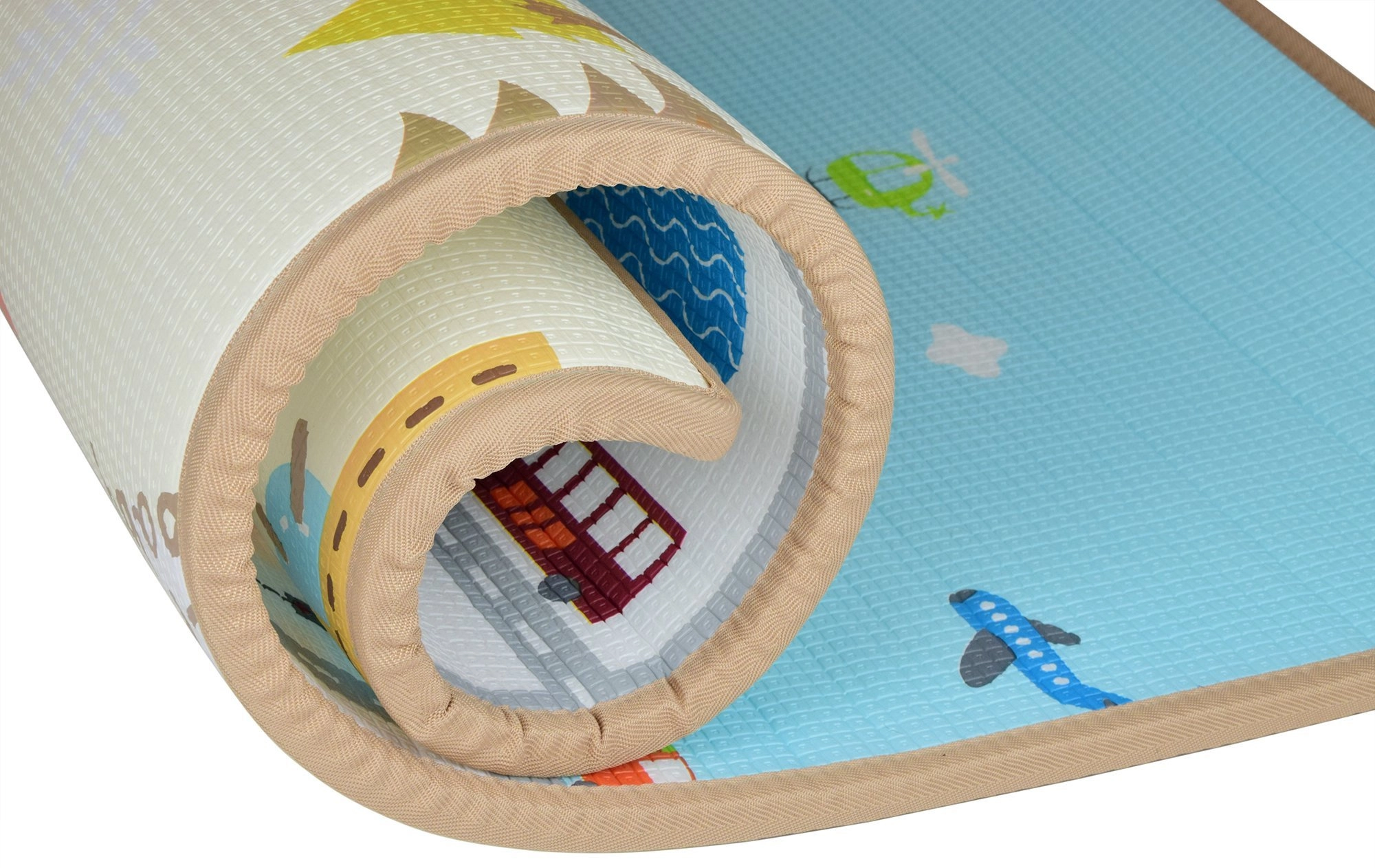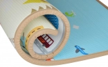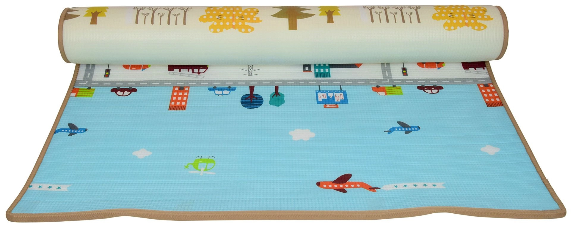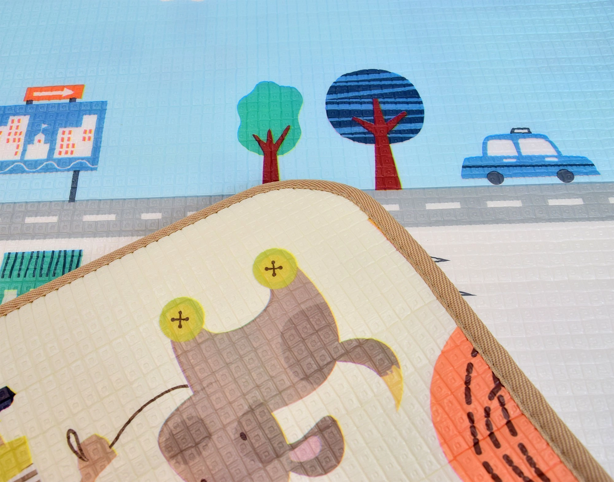 De ene zijde met een stads- en wegenprint stimuleert creatief spelen met autootjes, de andere zijde met schattige dieren prikkelt de fantasie en creëert een rustige sfeer.