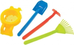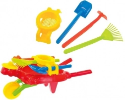 Het grote, draaibare wiel zorgt voor een soepele en stabiele rit op verschillende ondergronden, terwijl de dubbele steunen het mogelijk maken de kruiwagen veilig neer te zetten. Ergonomische handgrepen zijn aangepast aan kinderhanden en bieden een zekere grip. In de verpakking zitten praktische accessoires: harkje, schepje, hakje en zeef – ideaal voor het verplaatsen van aarde, het verzamelen van bladeren of het zeven van zand.