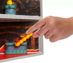 Beleef iconische momenten uit SUPER MARIO in de fraai uitgewerkte omgeving van Bowsers kasteel. De tweelaagse constructie in grijstinten met groene daken en karakteristieke “studs” zorgt voor een authentieke sfeer. Bij de ingang word je begroet door het hoofd van Bowser, een van de torens activeert melodieën uit de game, en het interieur komt tot leven dankzij de bewegende lift, vergrendeling en valkooi.
