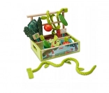 Deze kleurrijke set biedt alles voor realistisch en leuk spel: een bakje om te planten met stoffen “aarde”, een koord als wijnrank, worteltjes, appeltjes, paprika, boerenkool, twee mandjes en een kassa met geld. Kinderen kunnen de “oogst” laten groeien, oogsten en vervolgens verkopen op hun eigen kraam – allemaal op een veilige en stimulerende manier.
