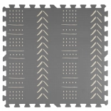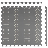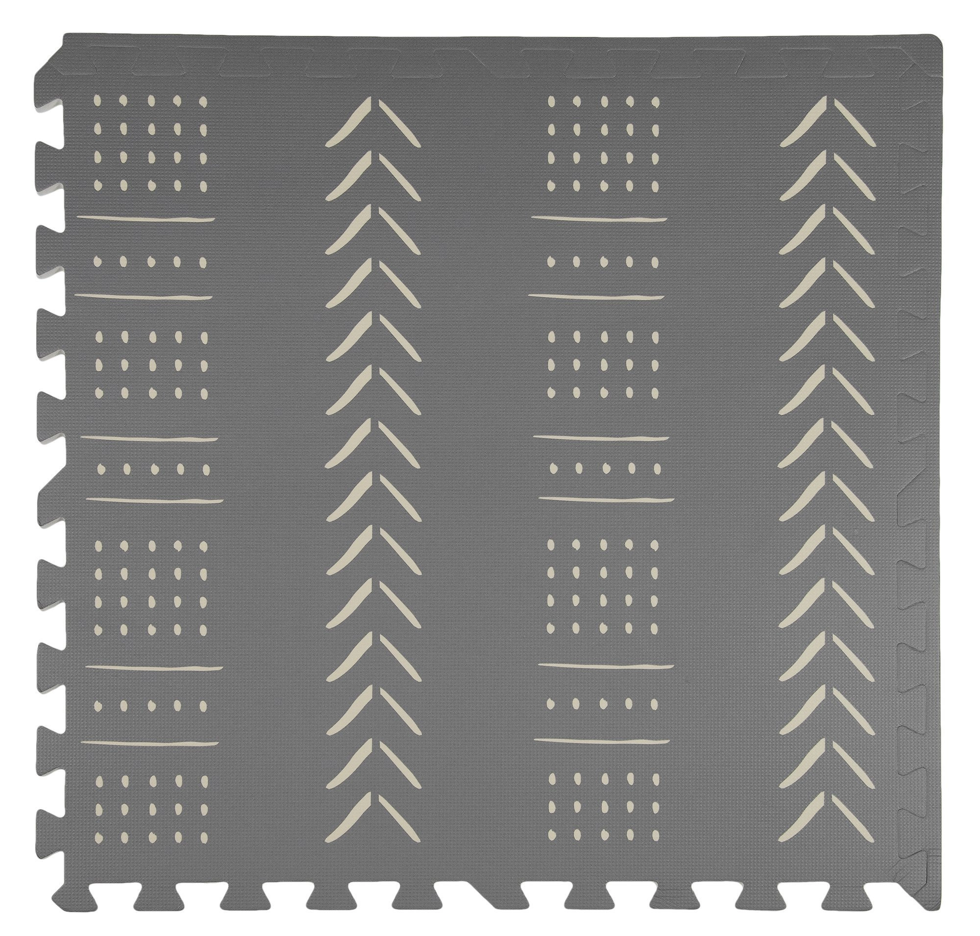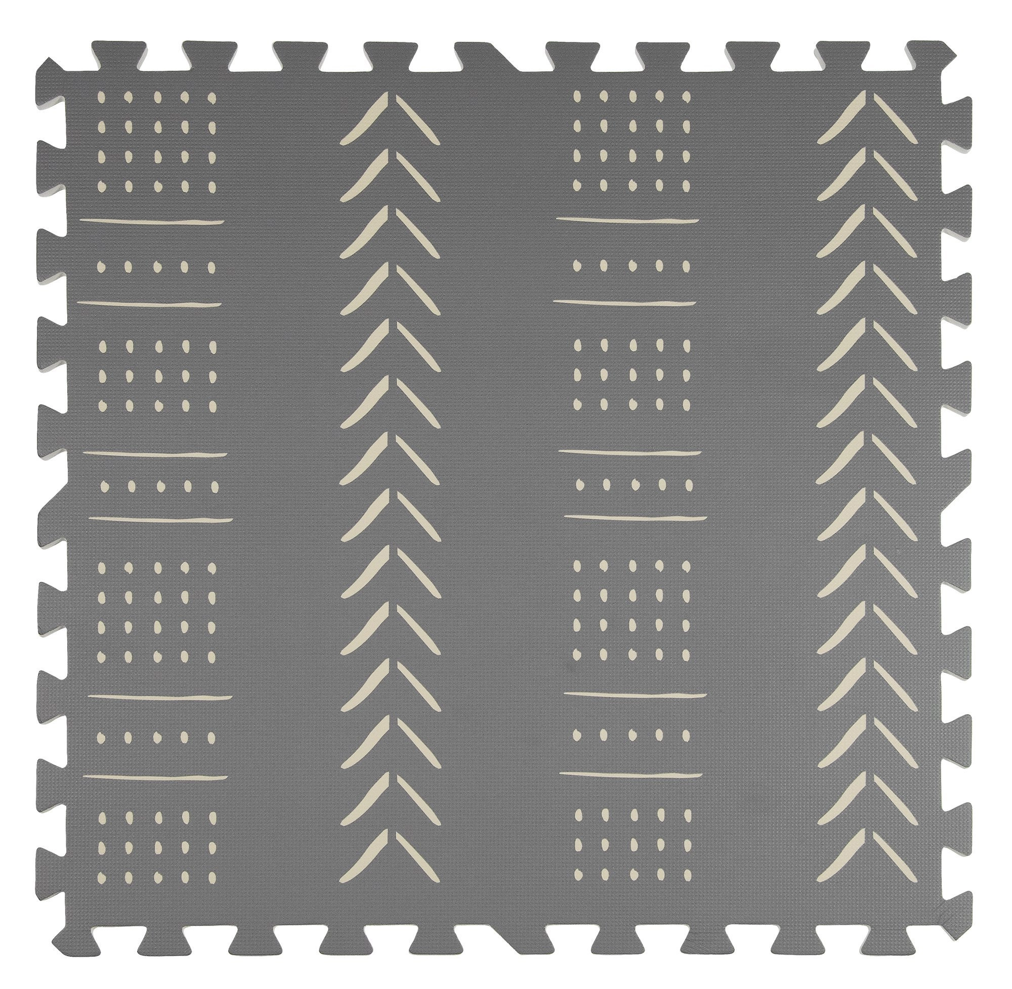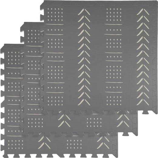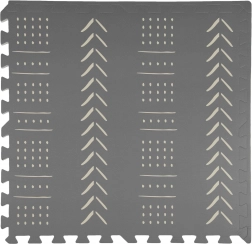 De stijlvolle en praktische HUMBI kinderspeelmat van schuim bestaat uit 3 grote tegels van 60 × 60 cm en 6 randen. Biedt een zachte ondergrond om te spelen, uitstekende isolatie tegen kou, is waterdicht, anti-slip en makkelijk te reinigen. Bevat geen schadelijke stoffen en voldoet aan de normen EN 71 en REACH. Subtiele grijze boho patronen passen in elk interieur.