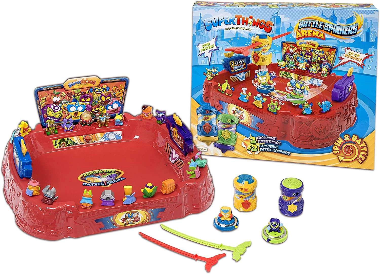 De set SuperThings Battle Spinners Arena verandert elk duel in een meeslepende show. Plaats de figuurtjes op de spinners, draai ze rond en laat ze los in de ring – de winnaar is degene die als laatste overeind blijft. De rode arena heeft een gereserveerde plek voor wachtende figuurtjes en een stevige ring voor eerlijke confrontaties.