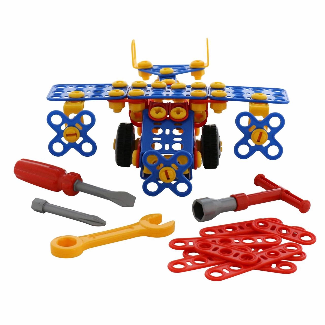 Deze kleurrijke constructieset laat kinderen een vliegtuig en andere eenvoudige modellen bouwen van geperforeerde onderdelen, verbindingsstukken en wieltjes. Er zijn ook kunststof gereedschappen (schroevendraaier, sleutel) inbegrepen, waarmee kinderen veilig echt schroeven kunnen uitproberen.