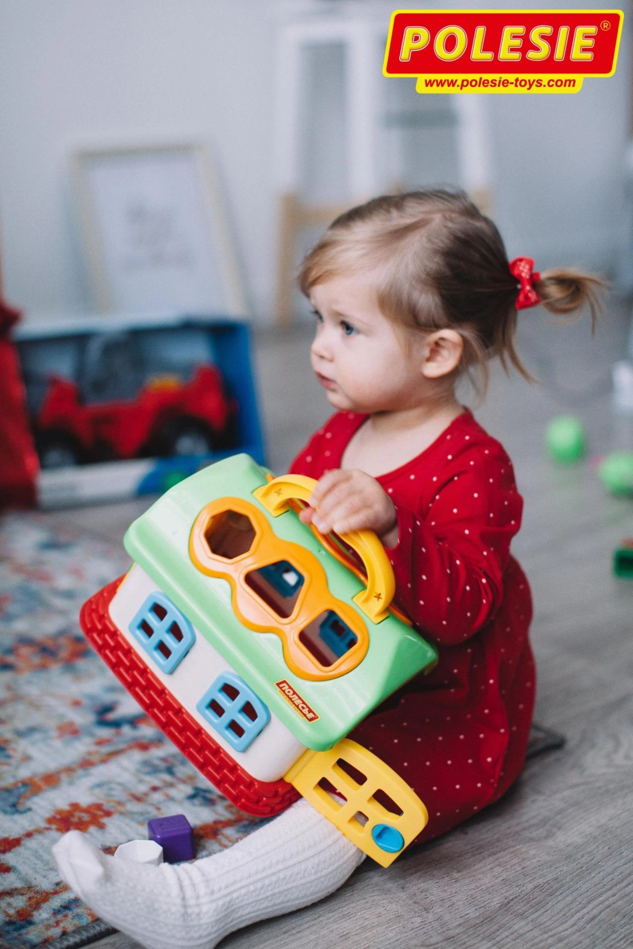 De openingen in het dak en de wanden van het huisje passen precies bij de gekleurde blokken – het kind traint sorteren, vormherkenning en oog-handcoördinatie.