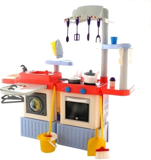 - Twee speelzones: keukengedeelte + gedeelte met wasmachine, wastafel en strijkplank