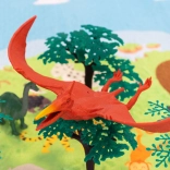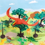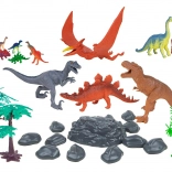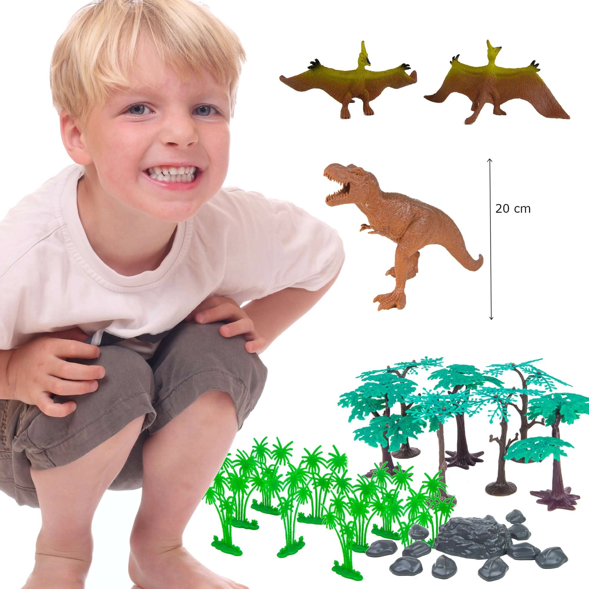 Vier grote figuren (waaronder T‑Rex en een pterosauriër), zeven middelgrote, zestien kleine plus bomen en rotsen. Bouw je eigen prehistorisch landschap en verzin je verhalen.