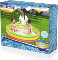 Het ronde zwembadje in regenboogkleuren van duurzaam vinyl biedt comfort en zekerheid bij de waterpret van kinderen. De zachte, opblaasbare en getextureerde bodem dempt stappen en isoleert tegen de kou van de grond, waardoor het ideaal is voor zowel het gazon als het terras. Drie afzonderlijk opblaasbare ringen behouden de vorm en verhogen de stabiliteit van de constructie.