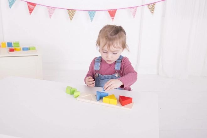 Eenvoudige vormen en heldere kleuren (rood, blauw, groen, geel) stimuleren het visuele waarnemen en logisch sorteren. Het plaatsen in de juiste posities versterkt het correcte toewijzen.