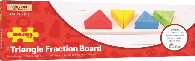 Vier kleurrijke sets driehoeken op een houten basis helpen kinderen het principe van delen en het geheel te begrijpen. Perfect voor een eerste kennismaking met breuken zonder onnodige druk.