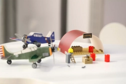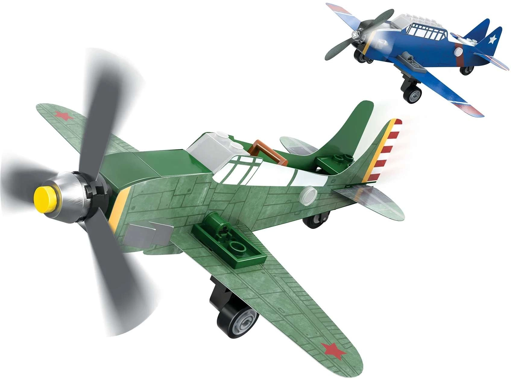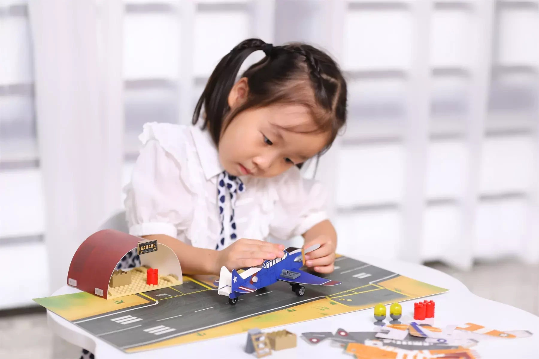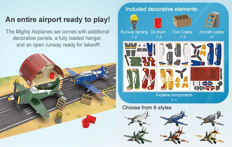 - blokjes, 8× clip-blokje, 20× papieren vliegtuigcomponenten, 2× verlichting voor landingsbaan, 3× oliedrum, 2× gereedschapskist, vliegtuigladder, handleiding