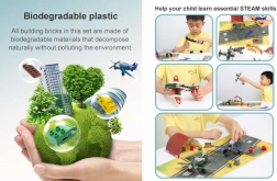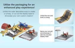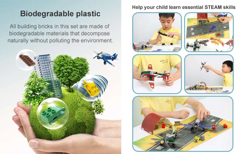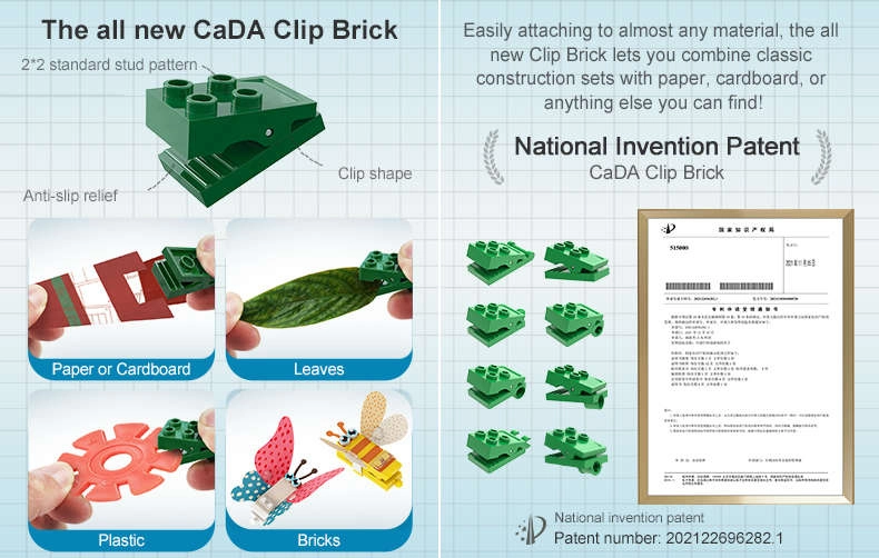 In de doos zitten clip-blokjes die je aan papier of stof kunt bevestigen, zodat kinderen ook buiten de standaard blokelementen kunnen creëren. De doos fungeert als landingsbaan of standaard voor het tentoonstellen van de voltooide modellen. Onderdelen zijn compatibel met andere CADA-sets.