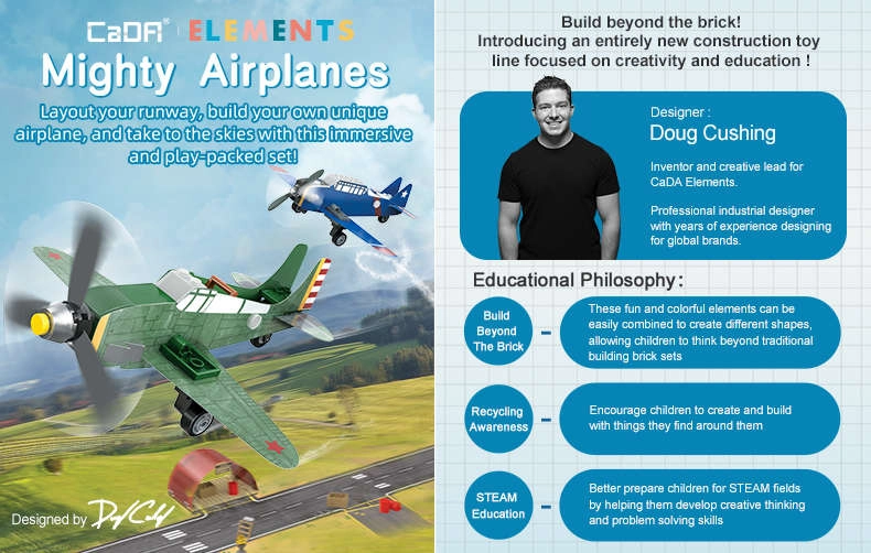 De CADA Elements bouwset stimuleert fantasie en technisch denken. Dankzij twee unieke luchtframes en 6 sets decoratieve panelen ontstaan originele toestellen uit een combinatie van papier en bouwblokjes. De set bevat ook een landingsbaan en thematische accessoires voor realistische scènes.