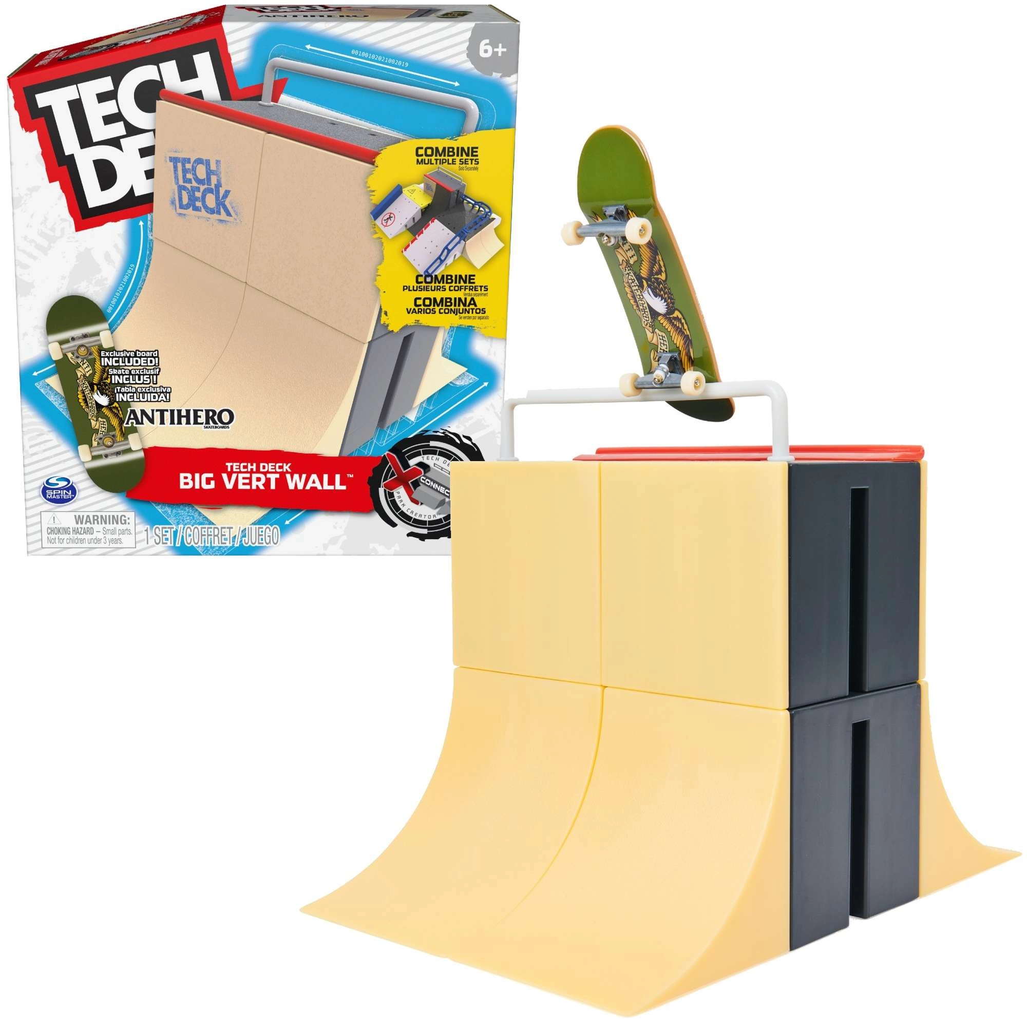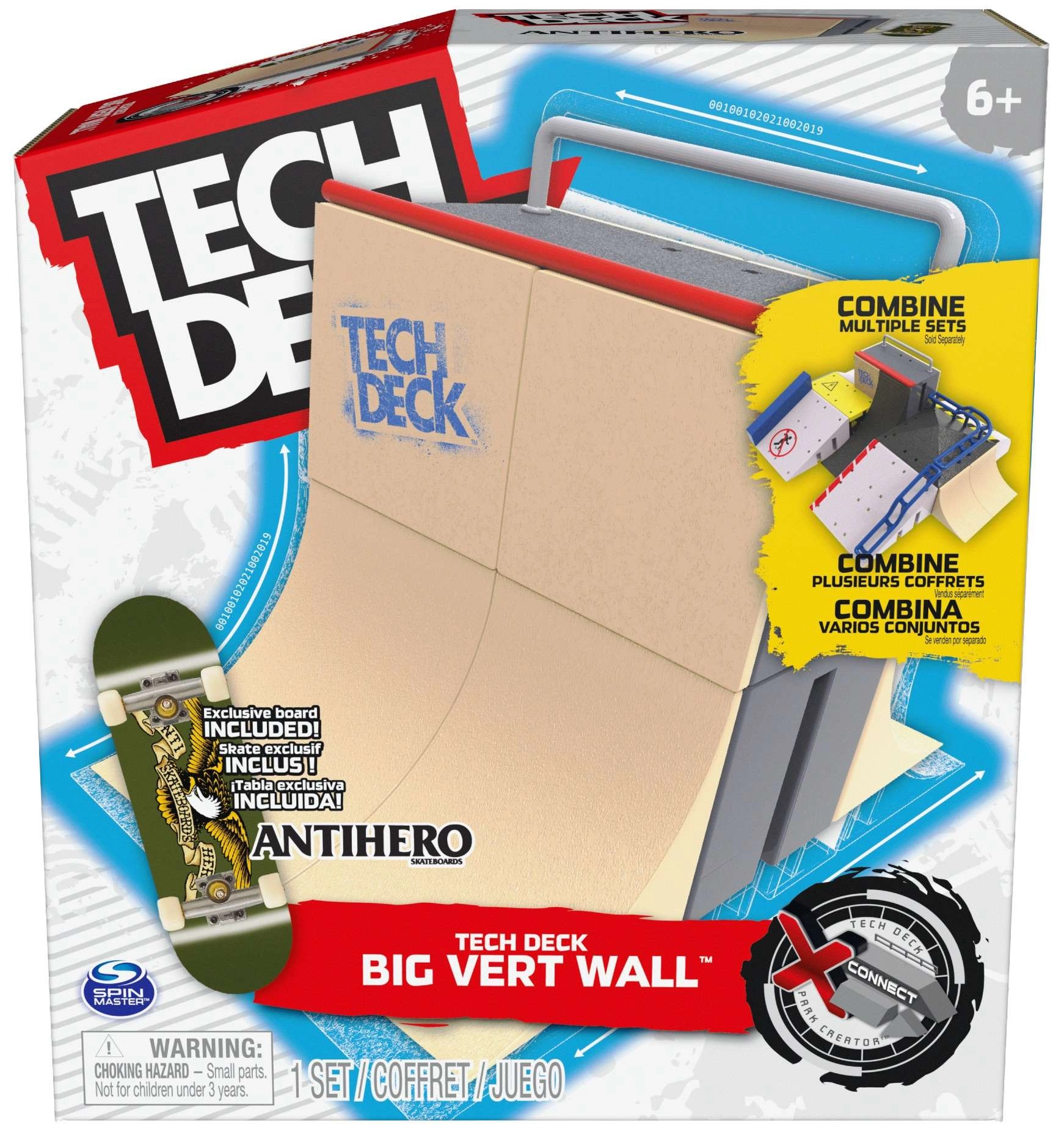 Beleef realistische fingerboard-trucs met de Big Vert Wall-ramp uit de serie X-Connect en het originele TECH DECK Antihero fingerboard. Het systeem met koppelbare ramps maakt het mogelijk je eigen park te bouwen, grinds, sprongen en fliptrucs te trainen en je skills continu te verbeteren. Ideaal voor zowel beginners als gevorderde fingerboarding-fans.